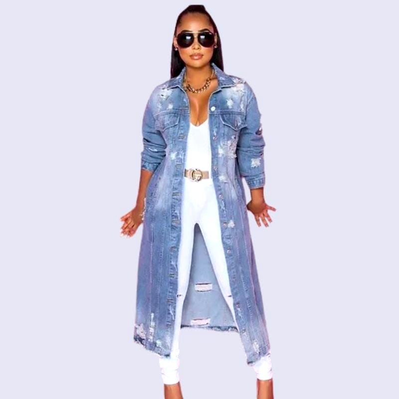 Q: Can a denim trench coat be worn in different seasons? A: Absolutely! A denim trench coat is a transitional piece that can be layered over other clothes to suit various weather conditions. It's light enough for spring and fall and can be layered for warmth in winter.