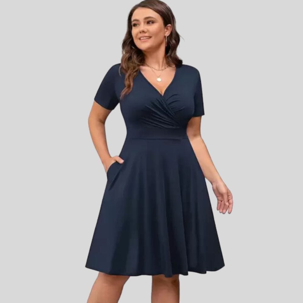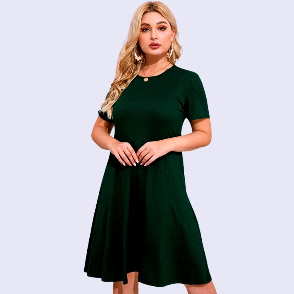 A plus-size swing dress is a loose-fitting, A-line dress that flares out from the bust or waist, creating a flowing silhouette.