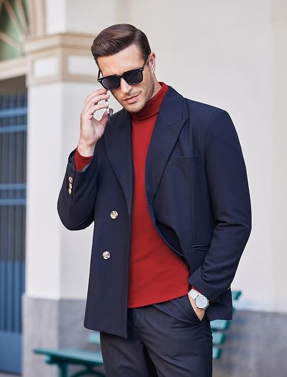For those occasions that call for a more dressed-up look, a turtleneck can be a chic alternative to the traditional dress shirt and tie. A fine-knit turtleneck under a tailored suit or paired with a velvet blazer elevates your formal wear. Accessorize with a pocket square and cufflinks for added details that stand out.