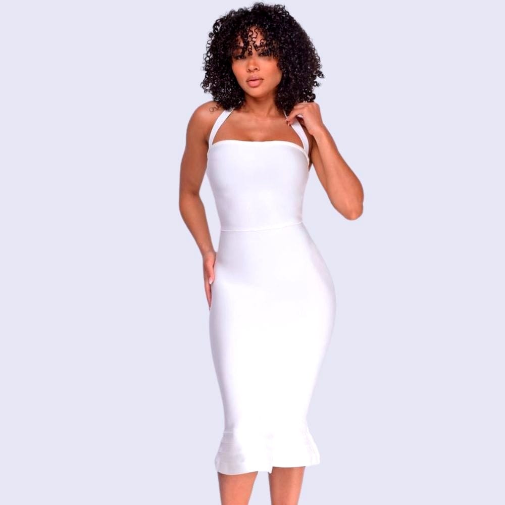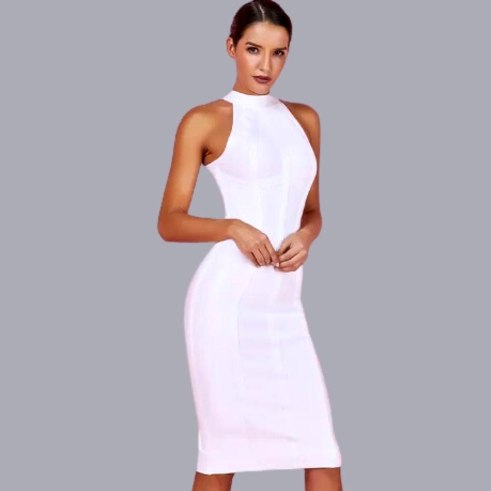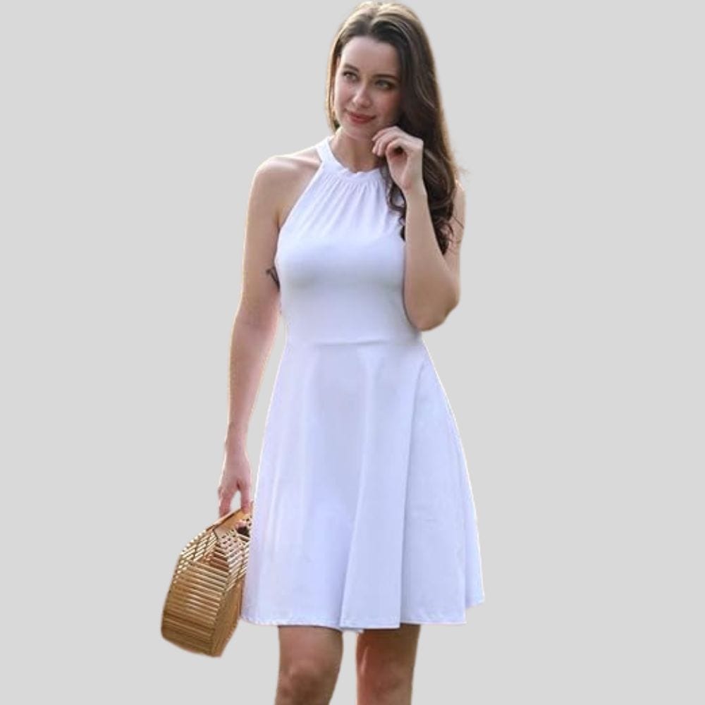 A white halter dress is a sleeveless dress with a strap that wraps around the back of the neck, leaving the shoulders and upper back exposed, and is typically in white.